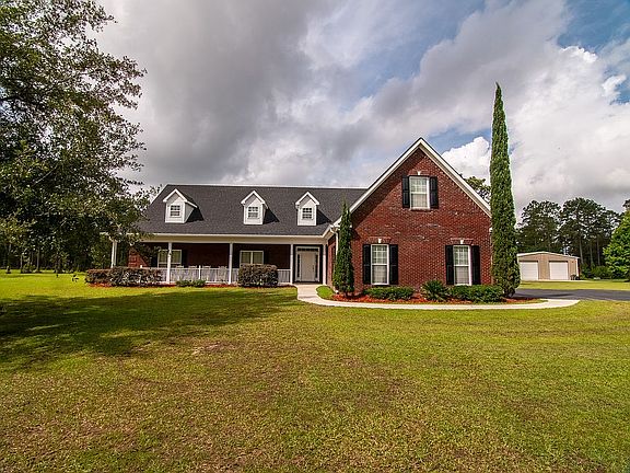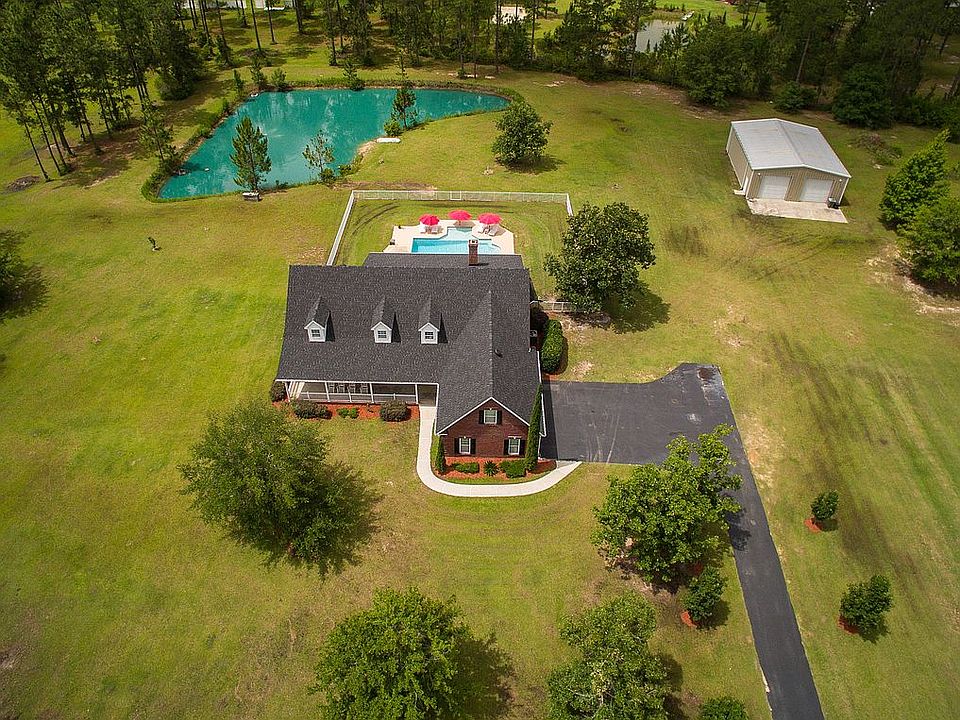 You must see this all brick beauty solidly built on 4 acres! The location offers all the benefits of country living with the convenience of town just minutes away! It’s part of Rivernorth subdivision on convenient Shiloh Road in the Lowndes County School district. It’s 1.5 miles from I-75/North Valdosta Road. Listed well under appraised value This beautiful home has four bedrooms and four and a half baths. A rocking chair front porch welcomes you. The entry foyer has a vaulted ceiling and an oversized powder room. There are nearly 5000 sq ft of space in this open floorplan. Many extra details such as crown molding, tons of storage, granite countertops, hardwood floors and plantation blinds throughout. The large back porch overlooks the saltwater pool with a tanning ledge. The downstairs master bedroom features French doors that open to the sunroom which overlooks the pool and back porch. There are two large walk-in closets with built-in shelves. The luxurious master bathroom has a large tile shower with two shower heads, two vanities, and an enormous tub. Kitchen upgrades include granite countertops with custom tile backsplash, stainless steel appliances, lots of Cherry cabinets with roll-out shelves and an extra-large walk-in pantry. Abundant space for entertaining friends and family in this generously sized living/dining area that is the heart of the home. An entertainment closet hides all wires and cords while keeping your entertainment system dust free. Lots of natural light in the living room with surround sound and a brick fireplace with hearth and custom-built mantle. Upstairs hosts a guest bedroom with full bath and double sinks; walk-in attic; refrigerator and wet bar; entertainment room with office nook; large office with bathroom. The extra-large bonus area would be perfect for office, study, rec room, crafts, exercise, meeting/gatherings, homeschool or playroom. The possibilities are endless! Outside there is a 50’x40’ wired workshop/storage building with three large garage doors that allow you to pull through. Fish in the beautiful 1-acre pond stocked with catfish and bluegill. The entire four acres are irrigated with 12 zones of irrigation and four acres of wired underground dog fence. Enjoy crisp autumn nights with a fire in the firepit.