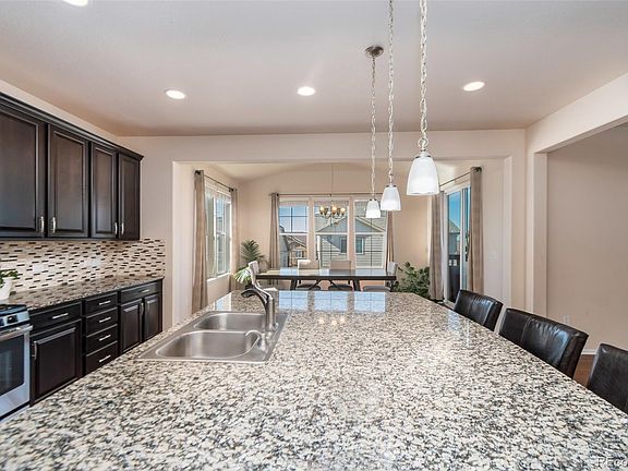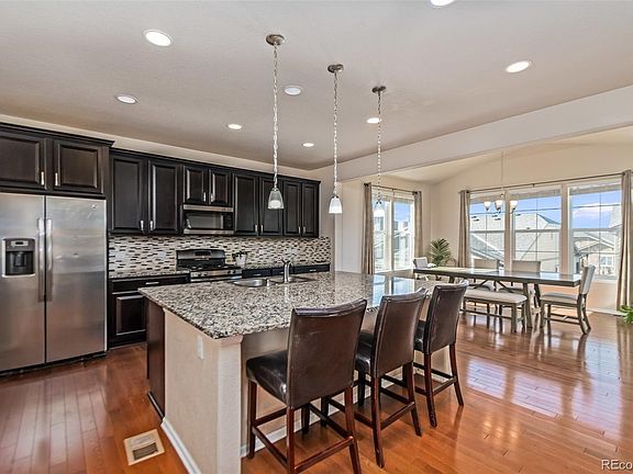 This nearly new Richmond Hemingway model features 4 beds, 3 baths, 2,716 Finished SF with a beautiful gourmet kitchen with stainless steel apps, slab granite counters, dark walnut cabinets with crown molding, a huge island, eat-in space, breakfast nook, and a walk-in pantry. The whole main floor has pristine oak hardwood floors except the front living room, which could be used as an office. Upstairs you'll find the master suite with 5-piece bath, private commode room, and a walk-in closet. A large loft/flex space, 3 more bedrooms, a full bath, and the laundry room are upstairs as well. The unfinished walk-out basement is ready for your personal touch. You'll never miss another gorgeous Colorado sunset again as this home has unobstructed mountain and city views. Plus, it's a short walk to a neighborhood park and minutes away from Southlands Mall with dining, entertainment and shopping, and just a few more minutes from Aurora Reservoir with all it's recreational amenities. Come & see!