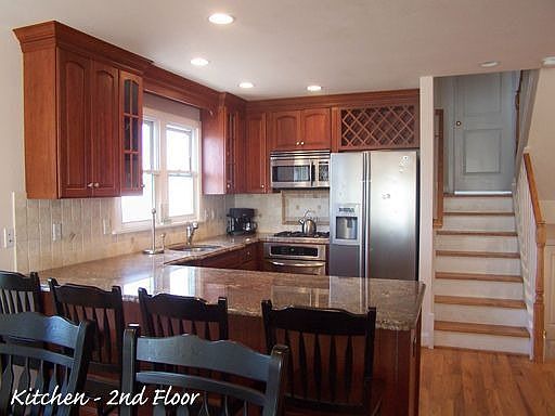 Beautiful corner bayfront townhome offering 5 bedrooms and 4 full baths with southern exposure allowing plenty of natural sunlight and a fabulous setting sun. The upside down design offers a wonderful great room with granite kitchen featuring stainless steel appliances, hardwood floors, and gas fed fireplace. Decks abound on each level so there is plenty of space for both interior as well as exterior living space. The beautiful roof lines give the look of a charming Nantucket home. You will enjoy the dock and boatslip as well as the ample garage storage. Home is being offered fully furnished.