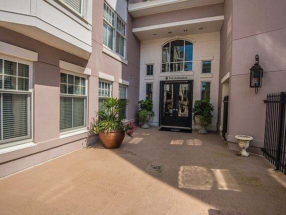 This unit is larger, w/dual master+half bathroom. It's a corner unit with NEW HVAC, NEW water heater, plantation shutters throughout,granite counter tops, gas range, gas log fireplace, dual vanities in the master bath, custom painted bathrooms, dry bar and more.The kitchen is open to the main living/dinning area.Additionally, there is a nice size guest bedroom with a large walk-in closet, and an en-suite bath.The laundry room is off the kitchen and there is a powder room for guests+deeded storage.The Albemarle is just one mile from historic downtown Charleston, MUSC and Roper Hospital.The complex offers nice amenities including a pool,gym,community room,elevator.There is a large porch with storage closet, half bath off the foyer and TWO GARAGE SPACES for extra value to this condominium!