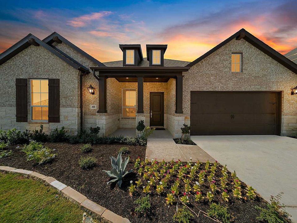 MLS# 2426294 - Built by Highland Homes - Ready Now! ~1 Story, 4 Bedroom, 3 12 Bath, 3 Car Garage, Stone Accent, Extended Covered Patio, Freestanding Tub and Separate Shower at Primary No neighbor behind! Dramatic entry with triple arch foyer, soaring ceilings, gorgeous gourmet kitchen with 3 cm quartz countertops, white cabinets, glass front decorative uppers, massive dine-in island wrapped in black beadboard, TWO pantries, stainless steel apron front sink, luxury vinyl plank throughout common areas, en suite in bedroom #4, lifestyle room, landscaping package includes two extra trees in back!