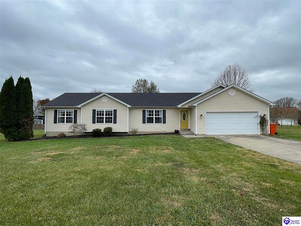 Step inside this adorable 3 bedroom ranch with an open living space and loads of features! Sitting on an acre lot in the Stoneridge Subdivision; only 5 min from I65, 35 min to Louisville, and about 25 min to Glendale and Blue Oval SK. Walk in to your living and kitchen area with cathedral ceilings and tons of natural light. Formal dining area with access to the back deck for warm weather dining and entertaining. Butler's pantry or office space right off of the kitchen with plenty of cabinetry and countertops for storage and prep. Head to the primary bedroom complete with en suite bath and walk-in closet. Two more large bedrooms, full bath, and large laundry room complete the main living space. Head downstairs to your full basement with plenty storage and potential to finish it out for extra square footage. Enjoy gardening or play in the large back yard and be sure to take the virtual tour!