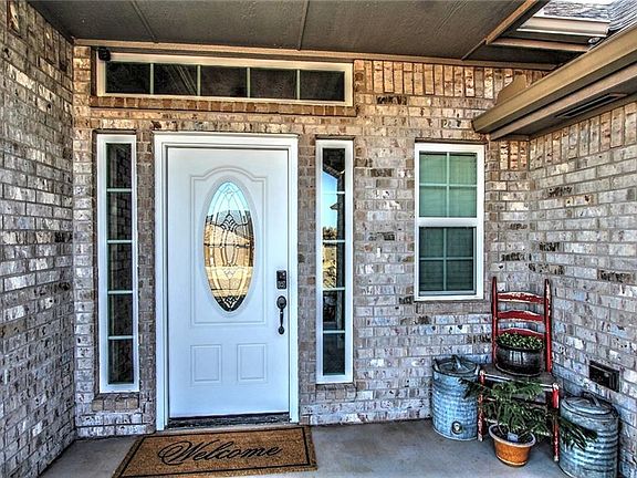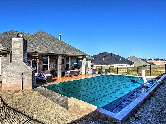 This beautiful home is only 2 years old finished feb 21! 3 bed plus flex ofc/den/bed does have two closets, 2 bath and full 3 car garage. This home has custom led lighted cabinets and pantry, and built-in cookbook shelving in this cook's delight kitchen. Step into the master bedroom with your own personal spa-like ensuite. Or enjoy the nights in front of the fireplace with custom mantle in the open concept living area. True mother-in-law plan with two large bedrooms and double closets on the other side of the home. Wood-look ceramic flooring in the kitchen, living, dining, entry, office and laundry/mudroom with carpet in all bedrooms. This home will be the showplace you are looking for! Wood privacy fence with wrought iron around pool. Step onto the oversized patio to find the inground saltwater pool, outdoor fireplace just waiting for you and yours to enjoy the peace and quiet of Blanchard.