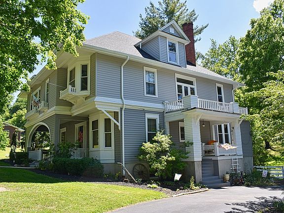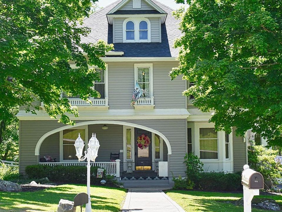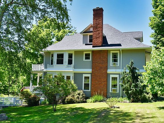 Stately Victorian on a lovely lot. Gleaming mahogany woodwork with old-time craftsmanship. 3 levels of living space with hardwood floors. Dining room, living room, family room and eat-in kitchen on main level. Owners suite with fireplace on 2nd level along with 3 more bedrooms and a full bath. 3rd level has potential as a guest suite or office space, with several additional rooms and another full bath. Pleasing outdoor space with covered front porch ,babbling brook, deck, fenced yard and barn.