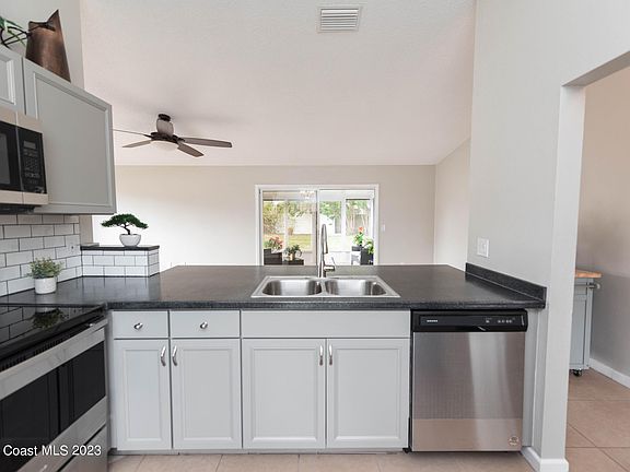 Remodeled, Large Corner Lot, Open Floor Plan offering New stainless-steel appliances, epoxy countertops, breakfast bar for 4 with easy access electrical, tile backsplash, and more. Natural light through large picture window in living room. Dining room features oversize siding doors leading out to the Florida room with a beautiful view of a matured Maple tree. New garage door installed Brevard model 824 with 50/60 large missile impact rated and sustained wind rated DAB helping lower your house insurance. Conveniently located to I-95, shopping centers and restaurants.