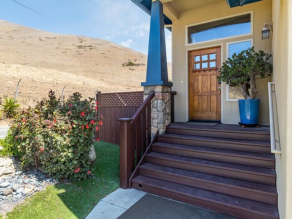 This beautifully furnished Morro Bay home has incredible views and is well kept. The upstairs has a spacious living room, dining room and kitchen that all open up to the 2nd floor balcony with beautiful views of the adjacent hills and the ocean in the distance. The living room features a large sofa, flat screen cable TV, and fireplace. The upstairs master bedroom has a king bed, cable tv, and its own incredible bathroom. The downstairs bedrooms both have very comfortable beds, one with a queen sized and television and the kids' room with two twins and access to the back yard. The downstairs rooms share a tiled bathroom with tub and shower. The home has a two car garage and on-site laundry. Pets are allowed. Furnished rental with a one month minimum rental term. Pets allowed. No Smoking.