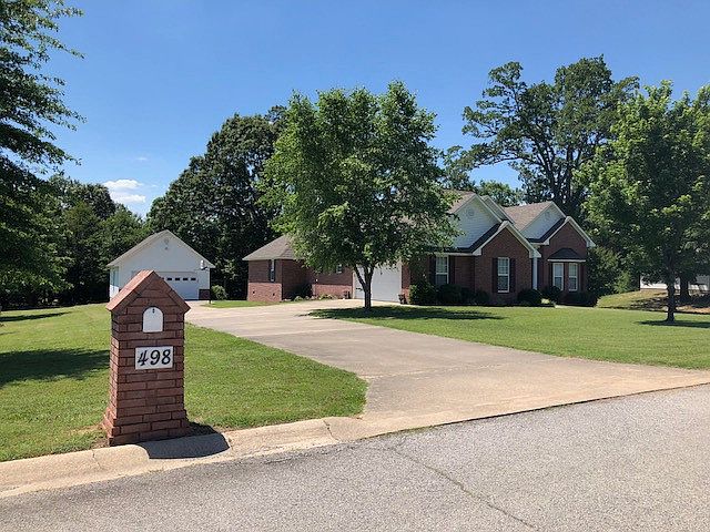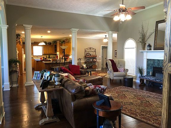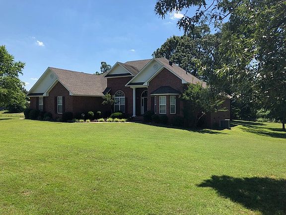 BEAUTIFUL AND TIMELESS 3-4 BEDROOM, 2 1/2 BATH HOME ON 2 ACRES... 2,800 sq ft home on one acre. Classic red brick exterior with a stately appeal from Roman Tuscan style columns felt throughout both the exterior and interior of the home. Lots of mature trees and a jaw-dropping backyard with a porch, large patio, and play area for children. Hand-scraped hardwood floors and 11' ceilings in living room make an immediate impression and the custom design touches throughout the home, such as built-in bookcases and moldings, make this home unforgettable. Lots of space for family with a formal dining room, dining area in kitchen, and an eat-at bar. Kitchen has beautiful solid surface countertops and an island for extra workspace. All appliances are included. French doors lead to a lovely office space that is private but not sequestered from the rest of the home.Ceiling fans in almost every room will keep you comfortable. Bedrooms have carpet and walk-in closets. Master bath has a whirlpool tub and enough space to never fight over the sink--there are two. More than just looks--this home has a large utility room, air purifier system in the ductwork, 2 car garage with insulated door, well-insulated walls and attic for energy efficiency, and a shop building for all of your practical needs