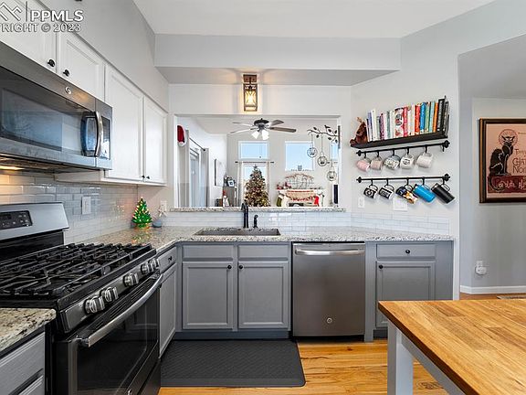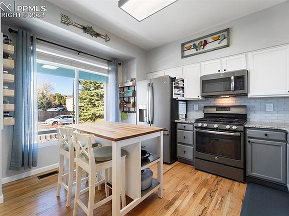 This meticulously well maintained home is ready for you to move in! This home has three things that you always look for when buying a home; location, location, location!!! You are walking distance to Scott Elementary School, ranked as a 4 star school by Schooldigger.com. The property backs up to the Homestead Trail and is right next to Mckown Park! By the way, Homestead Trail connects to Cottonwood Creek Trail, which connects to the Pikes Peak Greenway Trail, so if walking, biking or running is your thing you'll be right at home! You are also close to Austin Bluffs, Woodmen, and Powers Blvd. Shopping, hospitals, dining...you're close to it all in this Northeast side home. From the moment you arrive at this home you'll feel welcomed as there is a big covered front porch that is rocking chair ready! When you enter the home you are greeted by an open floor plan that is so desired these days! The open kitchen features granite countertops, a newer gas range, an island, and a pantry! The living room is warm and inviting, full of light, and features a stylish gas fireplace. Upstairs you'll find the bedrooms and the convenience of having your laundry on that same level. The primary bedroom features an ensuite bath and spacious closet with cedar trimmed floors! The home features newer windows, newer carpet, A/C, and maintenance free decking! You'll be spending a lot of time in your outdoor spaces because that's why we live in Colorado! You have a spacious shaded deck, a concrete patio with a pergola, a brick paver patio, lush green grass in your yard that is already fenced in for your fur babies. There is a sprinkler system to keep that grass green, and some gardens for your green thumb. The backyard is truly going to be your Garden Oasis. There is a full walkout basement with French Doors that lead to the pergola covered patio. A really nice touch is a concrete walkway from front to back that goes through an extra wide gate for added convenience.