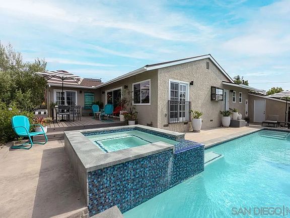 Situated on a meandering street that affords wonderful views of the neighborhood and treetops from throughout the property, this Mid-Century Bay Park home is highly upgraded and ready to impress with a custom pool and spa, new composite decking with built-in seating, and an incredible indoor/outdoor feel. Original wood floors and beamed wood ceilings welcome you to the large living space which enjoys wide-open views thanks to the extra large glass slider. Beautiful doors and large windows bring in tons of natural light throughout the home, while items like solar panels, A/C, a Nest thermostat and doorbell, and i-Aqualink for pool controls make this a comfortable and efficient home to live in – and to control from your phone. The updated kitchen boasts ceiling height shaker cabinets, stainless steel appliances and a glass tile backsplash. The extra large primary bedroom features built-in closet systems, plus easy access to the back deck via a sliding French door. The large bathroom showcases a soaking tub and walk-in shower, plus dual vanities. The wood floors continue through to all bedrooms and the hallway, which contains linen storage, a closet and access to a small attic. A two car garage and a large driveway make in and out easy. The laundry room off of the kitchen includes cabinet storage and pantry storage. Nestled within a quiet pocket up the hill from Mission Bay, this central location is close to shopping, dining, transit and parks. Don’t forget to check out the side yard to see the fruiting lime, lemon and orange trees – perfect for a home grown drink garnish!