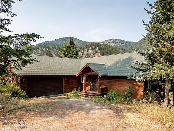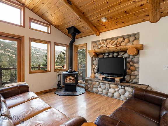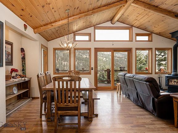 Situated in Gallatin Canyon, this home includes an expansive lot and the neighboring vacant lot, featuring an end of the road location offering privacy and seclusion. The large deck provides opportunity for outdoor entertaining while taking in the views of the canyon. An open concept kitchen, dining and living room boast high vaulted Pine ceilings, sliding glass doors to the deck area, large windows and a wood burning river rock fireplace. The owners will enjoy the main level master suite with fireplace, deck access and a walk-in closet. This home is perfect for those who desire close proximity to the Gallatin River, nearby trails, open space and easy access to Big Sky's Town Center.