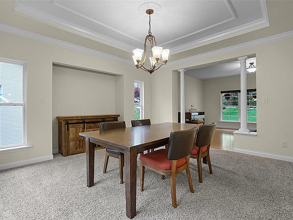 Spacious 4Bed/3.5Bath/3Car Garage 2-Story w/over 3200sqft situated on a quiet dead-end street in Paradise Valley Golf Community. Featuring 9'ceiling Main & Lower, Coffered ceilings, crown, Bays, hardwood, 6-panel doors, ML Laundry, & more! Kitchen is at the heart of the home for a large gatherings. Open to the Family Rm w/gas FP, wetbar, & slider to the deck. Includes an abundance of prep & storage, 42" maple cabs, breakfast bar & bay overlooking the backyard, or sep dining for a formal setting. UL includes a large Bonus Rm, French doors to the Master w/coffered ceiling, walk-in closet & Sitting Rm that makes a great office/possible nursery, priv. ensuite w/comfort maple vanity, dual sinks, jetted tub, sep shower, priv. commode & linen closet. Two beds w/shared full bath, other w/private ensuite w/tub/shower combo. Full walk-out LL is an opportunity to finish to your needs w/rough-in. Fenced in yard backs to trees, deck w/pergola & patio. All this just minutes to I-44 & Hwy 141!