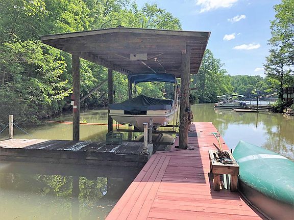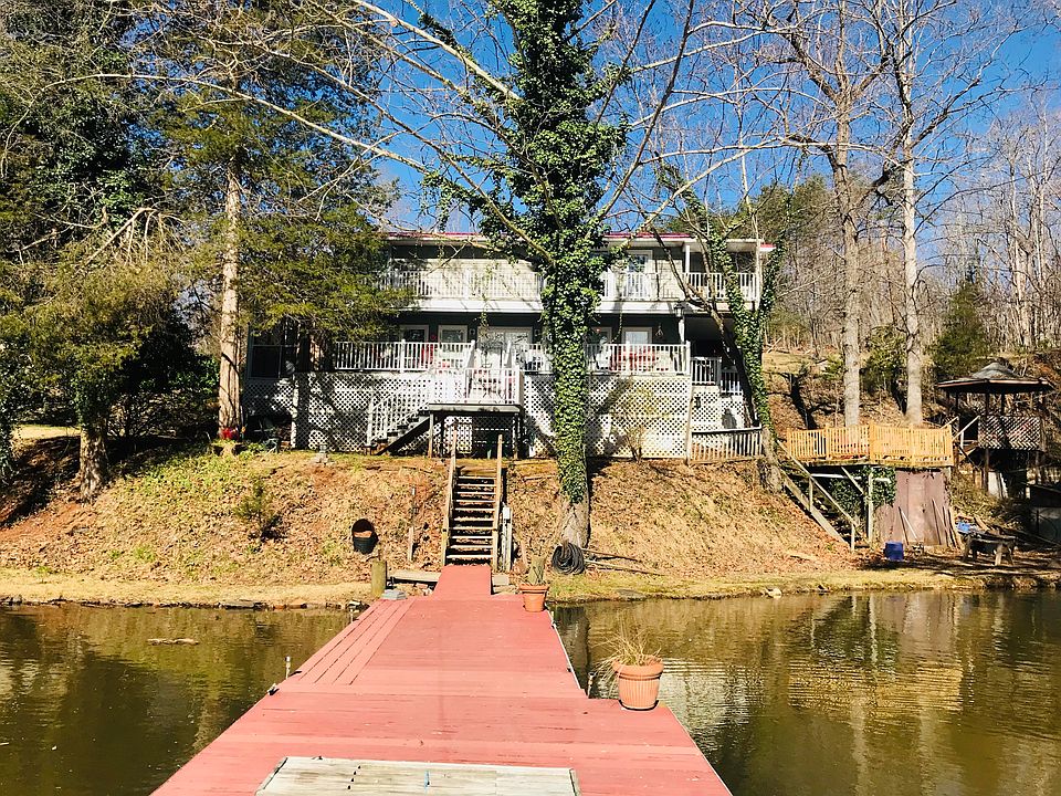Affordable and adorable lake home with 3 bedrooms, 3 full baths, 2.27 acres and approx. 169' of waterfront. Updated kitchen with granite countertops, island and stainless steel appliances on the lower level which is open to the dining area and family room with fireplace which is great for entertaining and walk out to large deck and easy access to the lake, Updated bathrooms, Screened Porch, 2 Storage Buildings, Circular Driveway and 2nd driveway to lower level of house, Covered boathouse.