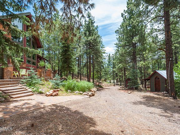 Nestled in the luxurious rural community of Mount Elden Estates, this reimagined home provides a modern escape into the Ponderosa pines across two acres. This multigenerational estate offers a combined 3,532 sq. ft., featuring 4 bedrooms and 4.5 bathrooms distributed among a main house, an overflow bunkhouse loft, and a single-level guest house, giving you flexible living options. The main house, the property's highlight, showcases floor-to-ceiling windows and an open-concept great room, including 3 bedrooms and 2.5 baths covering 2,058 sq. ft., with the primary suite on the main floor. Additional features comprise wood-encased windows, a covered patio, a large fenced-in area, a main floor office/den that could serve as a guest room, a custom wood spiral stairway leading to a spacious private guest bedroom equipped with a full bathroom, a new roof in 2025, and so much more. The oversized detached two-car garage incorporates an overflow bunk loft (original guest house) with a small kitchenette and a 3/4 bathroom. The additional single-level guest retreat includes 1 bedroom, a 3/4 bath, and a full kitchen featuring granite counters, copper sinks, travertine tile, glass tile backsplashes, in-floor heating, extra parking, a private entrance off Primrose, and a private side patio. The two acres boast two entry points and a circular driveway connecting multiple living spaces, sheds, and a garden shop for your customized use. This property is steps away from the endless miles of hiking and recently expanded single-track mountain bike trails. Just minutes away from Arizona Snowbowl Ski Resort and yet situated only a few miles from downtown enhancing the allure of this property. A home inspection has been completed, confirming that this home is in excellent condition. The owners are meticulous.