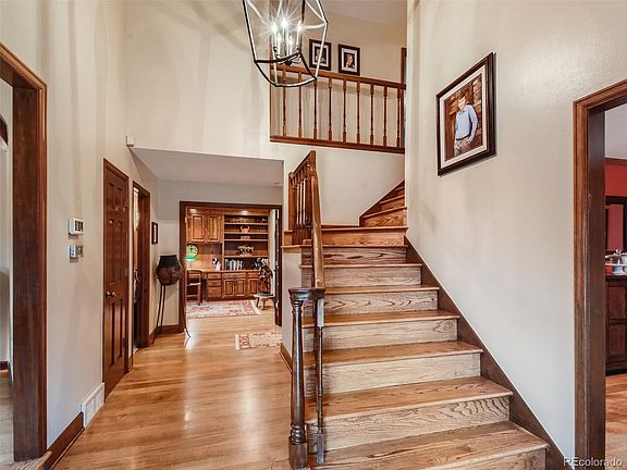 This charming 2 story home is located in the much sought after Coventry, a gated community of 202 homes in the Columbine Valley area of Littleton. It is situated on a .32 acre lot in a quiet cul-de-sac along a greenbelt. Inside, you will find hardwood floors and a custom kitchen remodeled right down to the studs. Finished with high end appliances including a Thermador 6 burner gas range and custom cabinets to the ceiling. The large custom cherry wood island has seating as well as an eat in kitchen area for casual dining. The formal dining room has a direct pass through to the kitchen. The adjoining family room has a cozy brick fireplace and the rotunda shaped living room makes for a perfect spot to enjoy a good book or use as a second office. The mudroom/laundry is off the garage with a large pantry and exterior door. An office with built-ins and a powder room complete the main level. Upstairs, the primary suite has high ceilings with a huge walk-in shower, dual sinks and heated floors. There are 2 more bedrooms both with walk-in closets while the 4th bedroom has an enormous walk-in closet, storage nooks, skylights, high ceilings and an attached sitting or office area. On the lower level enjoy a movie, games or a workout in the finished basement. There is also a bathroom and a large storage space in the utility room. The backyard has a built in grill and prep area, water feature, hot tub, fire pit, flagstone patio, mature landscaping and a flat grassy yard. The driveway has additional room for parking. A newer electrical panel, A/C (2021), furnace (2021), 2 water heaters (2015), and 5 year roof certification will give you peace of mind knowing that little needs to be done at time of move in except to start enjoying your home and meeting the neighbors. Located close to the Mineral Light Rail Station, Columbine Country Club and Historic Downtown Littleton shopping and dining while also in the Award winning Littleton Public School System makes this property a true gem.