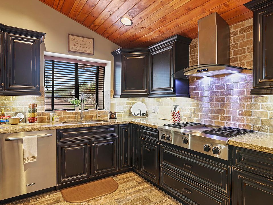 Wood-burning fireplaceMountainside viewsFruit-bearing apple treeSpacious deckGranite countertopsAdjustable queen-size bedDesigner cabinetry