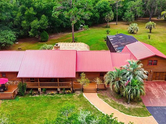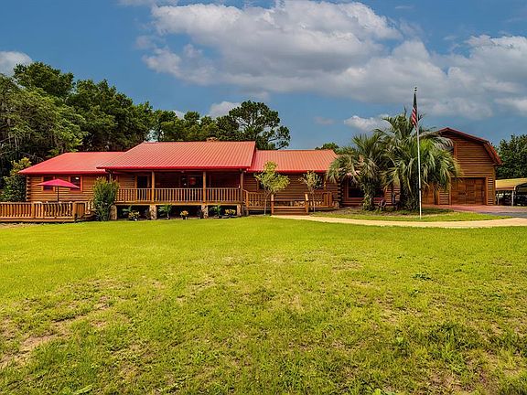 Active with Contract - Accepting Back up Offers. Custom-built Log home that shows pride of ownership! Total square feet, 4,422; with 3,267 square feet of living space with soaring cathedral ceilings this home offers that spacious feel and privacy as it sits on 2.74 Acres in a highly sought-after community that backs up the Withlacoochee State Trail for quiet walks; bike riding, and horseback riding. As you drive down the long driveway that leads up to this amazing Log home you will notice there is plenty of parking space and how meticulously maintained the land and home is kept. A large deck and porch in the front of the home where you can relax and enjoy nature. As you step inside you will be impressed by the tongue and groove Hardwood flooring which continues throughout the home; an open floor plan with plenty of natural light flowing in. A living room that is impressive in size with floor to ceiling beautiful stone 2-sided Fireplace. The owners spared no expense in the home upgrades and remodel. A remodeled kitchen with plenty of custom hand-made wood cabinets; large Island workspace; plenty of granite counter space; newer stainless-steel appliances. A large dining room, breakfast room; and a huge walk-in pantry room. The huge family room is tucked away in the back of the home. Everywhere you turn there is not a space that has not been improved! This owner had an eye for maintaining the integrity of a log home and decorating like a pro interior designer. If you would like the furnishings too, perfect in a log home setting, it can be arranged at the right offer. A spacious Primary bedroom with remodeled en-suite with walk in shower. The other 3 bedrooms are spacious, and the 2 full baths were also remodeled. The private acreage is perfect for entertainment with the oversized Huge covered deck (16 x 30) and beautiful custom designed Tiki bar with beer keg and refrigerator in place. Across from the deck is a newer (2017) custom designed in ground chlorine or can be converted back to saltwater, 15 x 30 pool. Enjoy a tropical drink from the tiki bar while cooling off in the pool under the custom designed waterfall. Above the garage there is a huge in-law suite with a full bath; it would make a great theater room or at home office. Besides the attached oversized 2 car garage there is additional space in the separate enclosed 30 x 52 structure with 4 individual garage doors that allow for a workshop or storage of your extra vehicles/toys. Also, a carport for additional covered space and a shed for additional storage. This is a move in ready Log home that you must see in person to appreciate. Short distance to the Fort Cooper state park and rails to trails bike paths and others, not to mention close to downtown Inverness and its Amenities, you can see how everything you need is all right here. Metal Roof in 2011 and A/C in 2018. Set up your private showing today!