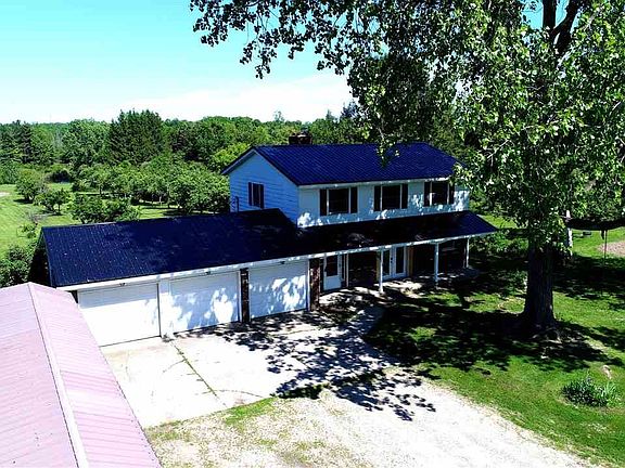 This 4 bedroom, 3 bathroom home sits back off the road on a private 19.7 acre setting. The home features all new flooring throughout, new kitchen cabinets and countertops, bathroom vanities, finished basement, 2 wood burning fireplace, attached 3 car garage, and more! The property features 2 ponds, 2 large garden areas, large two story pole barn with cement floor, large carport/storage, fenced in area with chicken coop, and plenty of apple trees, pear trees, plum trees, wild strawberries, grapes, blackberries and raspberries! Updates include a new steel roof, on demand water heater, and all new appliances including the refrigerator, oven/range, dishwasher, washer, and dryer. Home is natural gas.