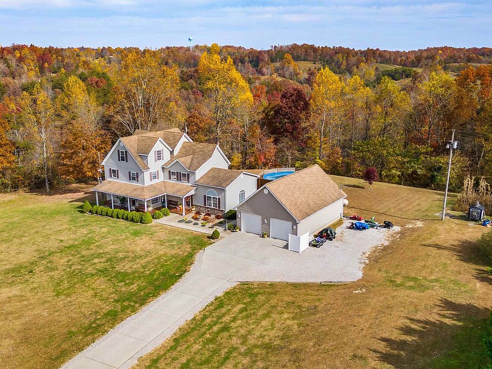 Wooahhh!! Check out this Beautiful house that looks like it is out of a page of a storybook. It is located on a dead end road with a stunning country setting! When you arrive..you will be greeted by a new black iron fence with electric gate for your privacy on Almost 3 fenced acres of mostly flat land. The stone work is gorgeous. Geo thermal heat and cooling with a outside wood stove. There is a fully insulated detached 26x40 heated garage with 16x40 storage above. A nice backyard area for entertaining with a above ground pool with deck. Inside the house you will find a large kitchen with Quartz countertops and solid hickory cabinet's. This home has a large primary suite on the main level and a second master suite upstairs. Title flooring and new fixers throughout.. too many details to list with over 4000 square feet of space to make your own.