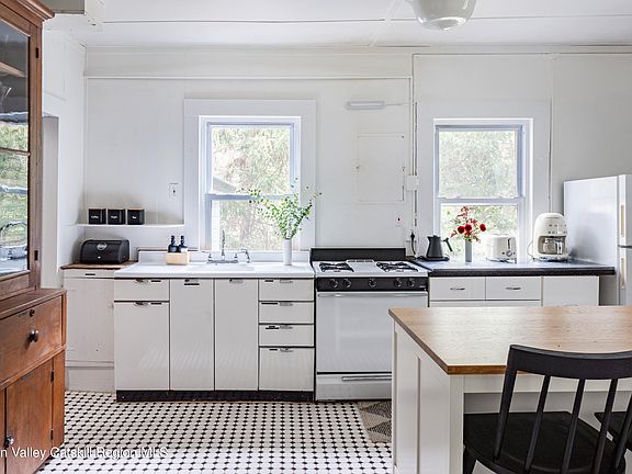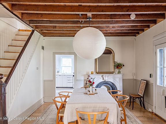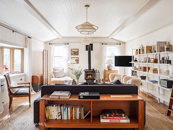 Classic Catskill farmhouse style meets easy living at this home whether you are looking for a full time residence, weekend house, or turnkey rental property. Offered fully furnished and with recent improvements including updated design from Alex Nino Interiors, new metal roof, new heating system, and new front porch—this property is ready for move in before ski season! Downstairs you'll find an easy flow between the spacious living room with cozy wood stove, an inviting dining room, and large kitchen with sweet vintage black and white tile. There is also a convenient half bath, laundry room, and charming flexible room —currently used as a bedroom. Upstairs are three more stylish bedrooms and a full bathroom. Outside, you'll find gorgeous hydrangeas, a fire pit, and plenty of space to garden. Perfectly located just 10 minutes from Belleayre Ski Mountain and less than 15 minutes to the cute shops and restaurants in Margaretville, Arkville, and Fleischmanns. All this and only 2 hours and 20 minutes to the GW Bridge in NYC.