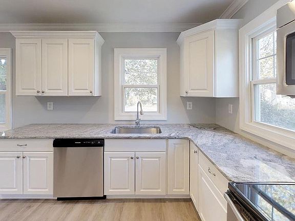 Redone Cape in the Mount View section of Mount Holly with detached garage. New roof, newer heater, new appliances, new windows. Eat in kitchen features granite counters, white raised panel cabinets neutral gray walls with gray wood laminate flooring accented with wide baseboards and crown molding. Living room off the kitchen with hard wood flooring, wide baseboard trim and crown molding. Two bedrooms on first floor featuring hard wood flooring and new windows. Beautiful sun room of the living room. Second floor features another bedroom, a full bath, sitting areas, and a cedar closet. Full basement partially finished with recessed lights and tile flooring. Detached garage and driveway allow for off street parking.