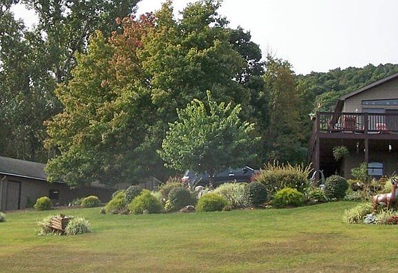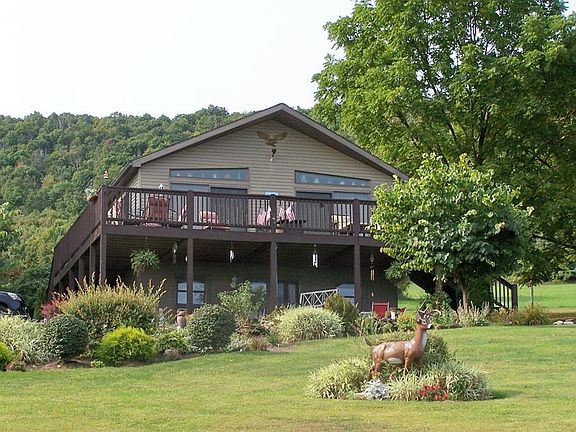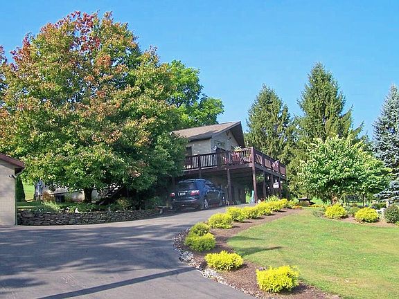 WOW, what breath taking views! This 2008 Ranch home with 5 Bedrooms and 3 full baths is nestled on a beautiful & meticulously maintained landscaped lot. Living room and dining room have tongue and groove pine boards w/cathedral ceiling. Sliding doors to wrap around deck to enjoy those wonderful views. Fully finished basement, 3 car detached garage w/power and heat, 12x22 storage shed with workshop & goldfish pond. Lower level has electric heat & pellet stove which could be utilized as an inlaw living area.