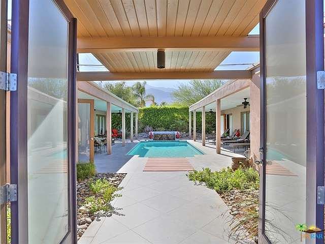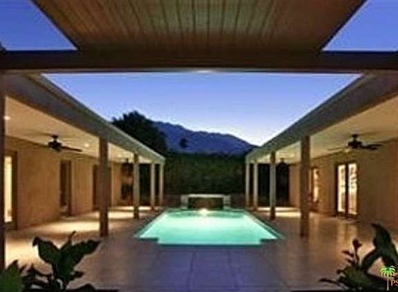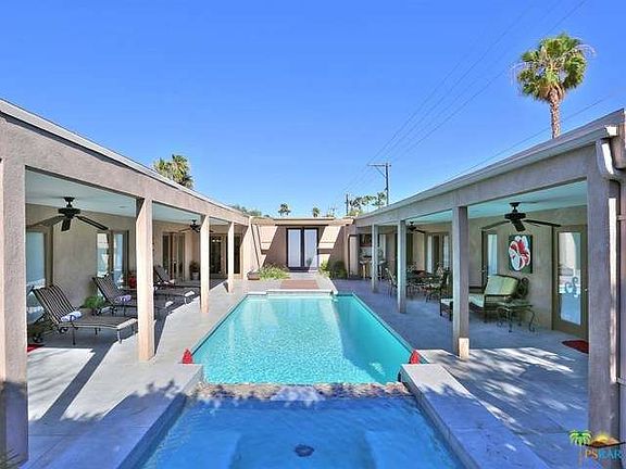 Quintessential Palm Springs Vacation Getaway! Come and explore this unique property. Two living quarters flank an inviting pool courtyard with gorgeous mountain views unobstructed by unsightly power lines. The main wing features a relaxing living area with gas fireplace to create the perfect spa retreat atmosphere. The updated kitchen provides all the creature comforts serving a separate dining area, yet open to your guests in the living room. A master retreat will captivate you with its grand bath and reading area. The second wing accommodates two additional bedrooms and shared bath. Your guests will have the luxury of privacy away from the main living area. The heated pool and spa are serviced by an outdoor wet bar. The desert scape lot is water efficient, and conforms to the natural surroundings.The property has an extended vacation rental history for the investor, and makes for the perfect personal retreat.
