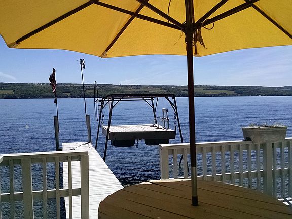 Seneca for under $200k! Improved camp setting or build your dream home here! Permanent dock w/ boat hoist, electric, running hot and cold water, vinyl sided beachhouse w/kitchenette & loft, separate bathhouse w/ toilet & shower!