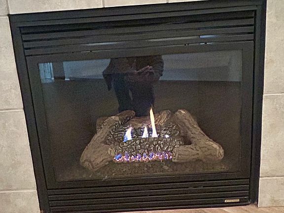 Beautiful large laminated wood family room with gas fireplace and snack bar.