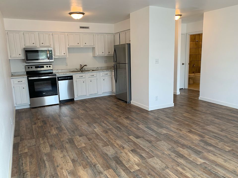 Updated one bedroom apartment with hardwood laminate flooring throughout, stainless steel appliances, and in building laundry. Landlord pays water/trash, tenant pays electric and gas