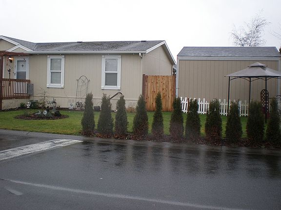 Hard to find, move-in ready 4 BR/2 BA Goldenwest on corner lot in an all age park! Pergola front deck entry; spacious home newly painted w/ split BR floor plan, open concept living space; island kit w/ newer 5 burner stove; thermo pane windows, cathedral ceilings; lg laundry room w/ solar tube & pet door to kennel and fenced backyard; nicely landscaped; parking for 3; shed & 8x16 studio/shop; heat pump & storage galore!