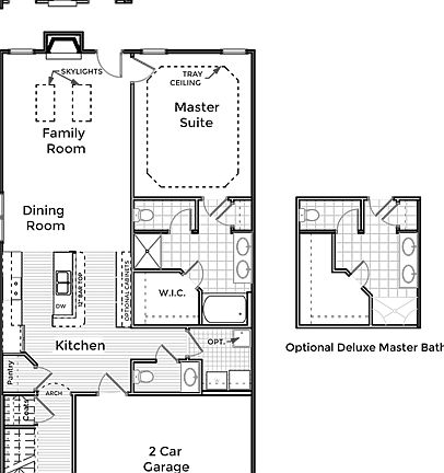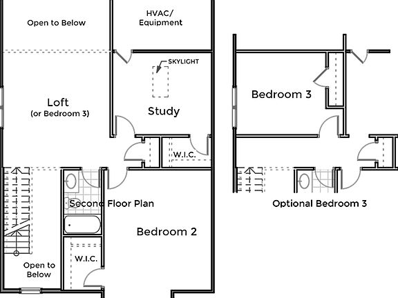 This two-story town home features a private master suite on the main level. The bathroom can be built with either a large walk in shower and extra room in the walk in closet, or a separate shower and tub. The galley style kitchen comes complete with a bar top island and the option to add a buffet. It is open to the dining area and the great room. The great room has skylights, and a gas log fireplace, which has the option to become a double-sided fireplace when adding the optional sunroom. Finishing out the main floor is the laundry and a powder room. The second bedroom, second full bathroom, study, and loft (optional 3rd bedroom) are all located on the second floor. Two-car garage.