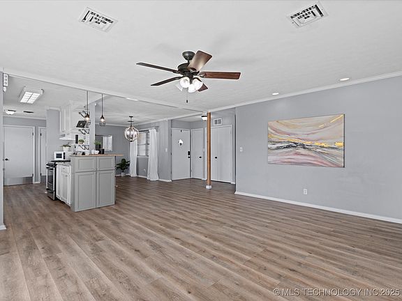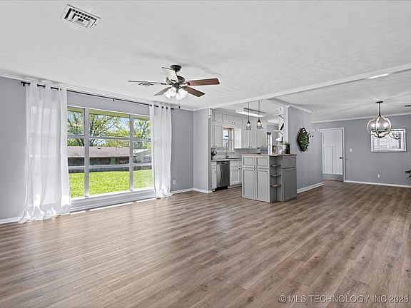 Honey Stop The Car! This charming home featuring a cozy covered front porch and a host of stylish updates throughout! New roof & guttering in 2021, along with all-new luxury vinyl flooring, new carpet, fresh interior paint, and updated lighting make this home move in ready! The beautifully remodeled kitchen includes a gas stove and modern finishes, perfect for everyday cooking and entertaining. Both bathrooms have been thoughtfully renovated—the full bath boasts a tub/shower combination, new vanity, tile accents, and custom shelving, while the half bath offers a fresh, contemporary look. Step outside to a fully fenced yard with a spacious patio, ideal for relaxing or hosting gatherings. Located just moments from Sooner Park, the pool, splash pad, and conveniently near Hoover Elementary and Madison Middle School, this home combines comfort, style, and a great location!