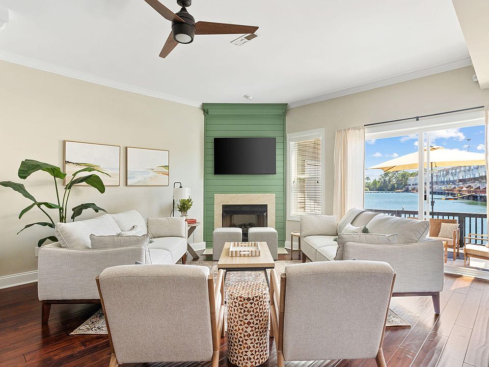 Active Short Term Rental sold fully furnished. All future bookings will transfer upon sale complete pass through investment at a high rate of return. This rental has many five star reviews with streamlined management already in place. This lakefront townhome has a retractable awning with a private dock and off street parking spots. The interior has light oak hardwood floors in the common areas and luxurious new carpet in the bedrooms. The open plan firstfloor is made for entertaining and enjoying life. The large kitchen has custom tile backsplashes, a breakfast bar, and lots of space for cooking.The kitchen opens into a full dining room with a bar cart area, and beyond is the well-lit living area with a gas fireplace and built-in entertainment system above. Glass sliding doors open to the waterfront rear deck and porch that features a private dock. A staircase with oak treads and balustrades leads to the ensuite bedrooms above, allowing multiple guests to enjoy the house with quiet and privacy. The second story of the house has a guest bedroom with space for up to four guests and its own seating area. Its bath has loads of vanity space, a walk-in shower, and full tub with custom tiled surround. Across the hall is the large, well-lit principal bedroom that and bathroom, with its deep garden tub, which both overlook the lake. The massive third floor bedroom is more than an ensuite with a large bathroom, it's an extra dwelling space unto itself. It features a large, well-lit sitting area with sliding glass doors leading to a private balcony overlooking the lake. The townhome offers the privacy of a stand-alone residence without the maintenance, and it is located across from a large, wooded parcel. There is street parking nearby for additional guests or tenants. Lake Palmetto is a quiet, waterfront residential community but is so close to I-26 to get to downtown Charleston, or to I-526 to hop to the islands and beaches, and is walking distance to the North Charleston Coliseum. The neighborhood is a short drive to bustling Park Circle's restaurants and shops, near the North Area brewery district and up and coming Navy Yard, and is just a few minutes from the Paradiso at Mixson, a family friendly club with a large, heated saltwater pool, cabana rentals, co-working spaces, a restaurant, and regular social events. 4993 Lake Palmetto is also moments to Charleston International Airport for quick weekend getaways or incoming guests.
