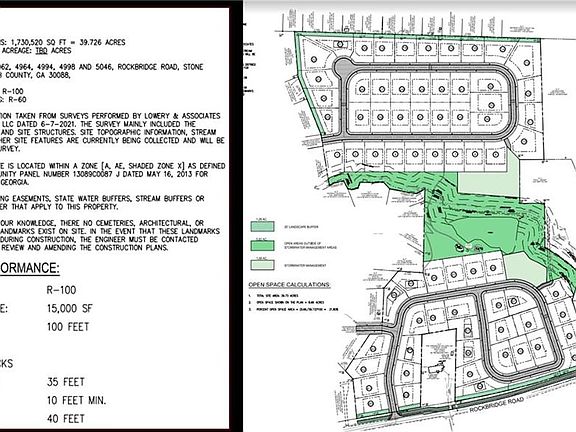 o +/- 39.7 Acres o DeKalb County o Zoned R-100 o 70 Single Family Lots o 100' Width Lots o +/- 900 ft Frontage on Rockbridge Rd o Assigned Schools: o Rockbridge EMS o Stone Mountain MS o Stone Mountain HS o 5 Miles to Exit 43 on I-285 o Located in an Opportunity Zone