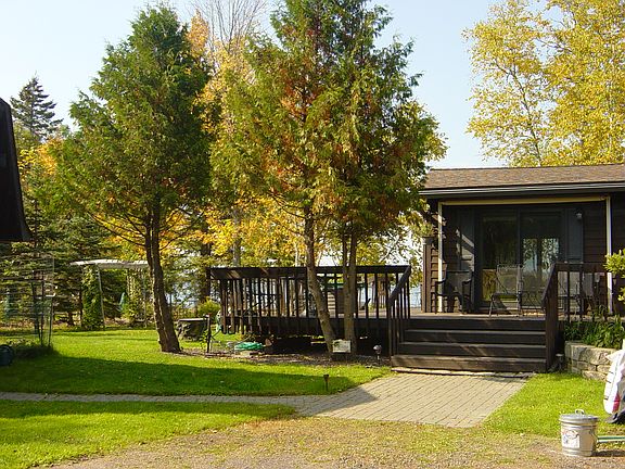 LAKE HOME LIVING! This 3 bedroom home sits, literally, on the shores of Big Grand Lake which is an amazingly easy proximity to Duluth and all areas! Situated close to the Lake Shore this property has so much to offer besides the year-round tranquil views....enjoy water sports just a stones throw from your deck, fish off your dock, or just sit in peace in the living/dining room while looking out at the majestic west facing views with breathtaking sunsets! An open living room/dining and kitchen provide a practical floor plan for lake living! One level convenience with a main floor laundry, attached garage, main floor master suite & 2 other bedrooms for guests & kids! Walk out to an adorable year-round log cabin with lofted sleeping quarters and gas stove! Parking for everyone, shed storage AND a lofted studio building complete with heated game room/studio and sleeping quarters! Plus...additional garage, covered storage space, lower level exercise area and upper balcony!! Don't miss the Raspberries, Blueberries, Grapes, Apple trees and Plum trees! The entire "RETREAT" is a well maintained piece of the lake that would be a special place to gather & enjoy for YOUR FAMILY & FRIENDS! - Efficient Dual Fuel Heating (Electric Baseboard & Gas Fireplace & Stoves) - Level Lot , Home right on the waters edge - Open Floor Plan - Updated Kitchen Appliances , quartz countertops - Master Bedroom with 3/4 bath en suite - 2013 New Septic System - Log Cabin w/ Sleeping Loft & Gas Stove Heat - Studio Building/1 Car Garage w/ Rec Area & Gym / Storage - Ample Parking Space