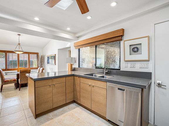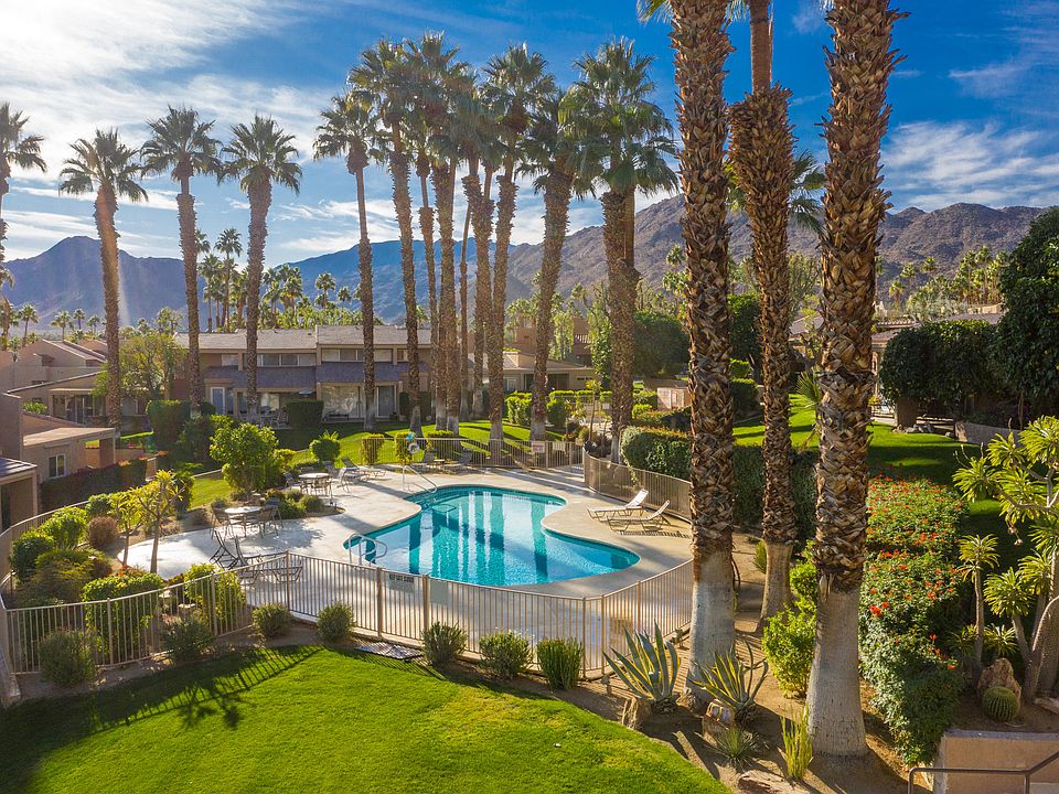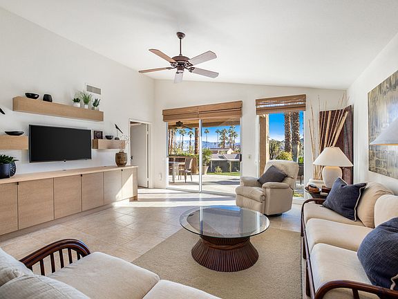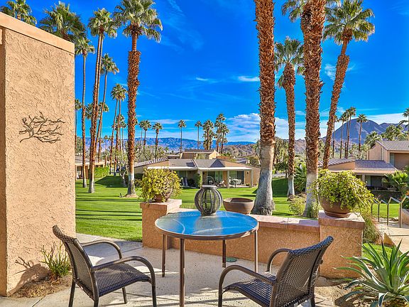 Enjoy spectacular panoramic mountain views from this elevated setting. This end unit has 2-bedrooms and 2-baths, tile flooring, indoor laundry room & pantry. Attached covered carport entry into kitchen and separate formal entry door into living area. Kitchen remodel features custom Brookhaven cabinetry from Kramer, PA with convenient pull out shelves. Two Velux skylights and Quartz countertops make the kitchen modern and light. Guest bedroom and bath with honed quartz countertop and linen cabinet. Master bedroom features a walk-in closet and bath with new cabinets and honed quartz counters. Great room has a 9ft entertainment center with Brookhaven cabinetry and wall mounted TV. South facing window in dining area. Steps lead down to HOA pool spa area and large greenbelt. Enjoy gorgeous sunrises & Mt Eisenhower views from expanded patio area that is perfect for outdoor dining and entertaining. Ample storage in carport with 2-cabinets and added storage off patio for garden items or golf clubs. This is a great location in the heart of Ironwood Country Club. Buyer to verify sq ft as this was originally a 1-bd 1-bath villa that has been expanded.