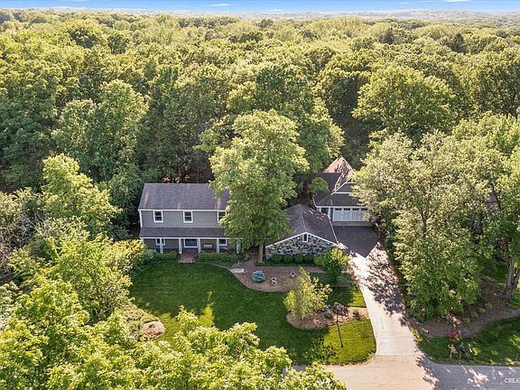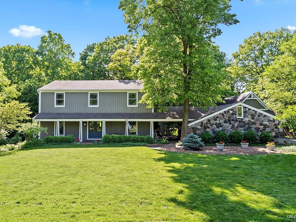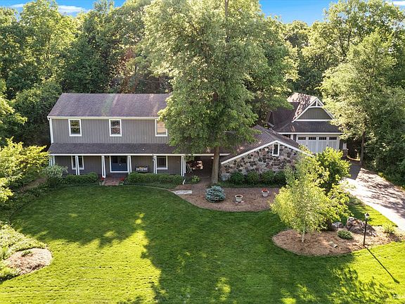 Welcome home to beautiful Wild Rose! This home is loaded with character, starting with the brick paver walkway up to the home. Gorgeous hardwood floors welcome you as you step inside. A first floor den that overlooks the expansive front yard is perfect for working from home. The large living room and dining room combo is waiting for you to fill it with family, friends, and laughter! A viking stove, granite counters, maple cabinetry, a breakfast bar, and stainless steel appliances complete the kitchen. A gorgeous brick front fireplace adorns the family room space which overlooks the spacious deck and wooded backyard-a true tranquil escape including a sunken hot tub and frequent wildlife visitors. Upstairs you will find 4 generous sized bedrooms, including a master suite with attached updated bath-quartz counters, new light fixtures, and porcelain tile floors. The finished basement offers additional living and entertaining space as well as a large storage area and access to the outside. The laundry shoot is a fun feature and makes doing laundry a little bit more fun. Outside there is not one but TWO garages accessible through the quaint breezeway and patio area. The second garage features attic storage and a 10x20 workshop that is heated and air conditioned! The roof will be getting replaced in June of 2023 on the whole home and both garages! The home has a whole house simplisafe alarm system that will stay. The HVAC system is new and has a smart thermostat for maximum efficiency to go along with the energy efficient windows. Conveniently located down the street from Wild Rose Elementary. Come see this beautiful home for yourself!