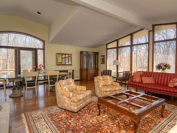 Solid brick ranch on a stunning 1.6 acre heavily wooded site on Crane Road. Enjoy the convenience of quick access to parks, shopping and downtown St. Charles, while enjoying the peace, quiet & views this stunning lot! Desirable floor plan with spacious Great Room that has a floor-to-ceiling brick fireplace as well as oversized windows offering incredible views - as well as access to the raised deck. The master suite features vaulted ceilings & oversized windows & backyard views - the master bath features a sunken whirlpool tub, granite countertops & fireplace. Hardwood throughout the main floor. Additional living space in the finished walkout lower level: Large Family Room with fireplace, as well as a REC/Bonus Room. Generous storage space. Home has been well maintained: roof (less than 5 years old), Porch recently redone. Deck recently redone. Septic system recently serviced & well pump is new. Owners will leave the sauna (never used). Must see!! 27+ Page eBrochure.