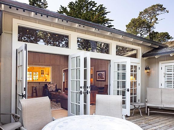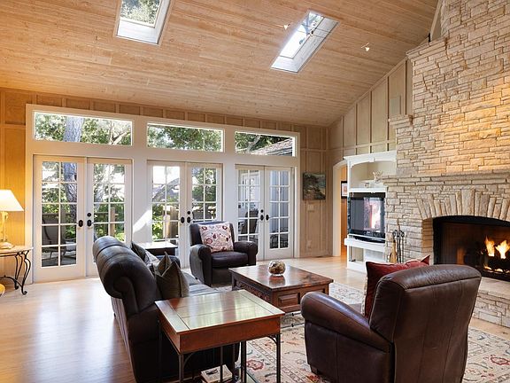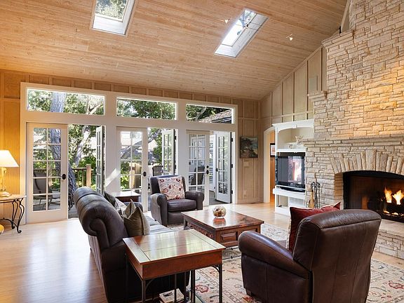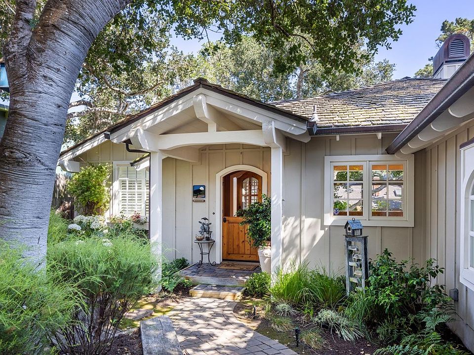 Moonrise ~ a single story custom home with Carmel Charm built in 2000 by well-known builder, Frank Bruno. The living room, the heart of the home, features a large and beautiful Carmel Stone fireplace and a triple set of French doors leading to a big deck surrounded by lovely landscaping. The nicely appointed kitchen is open to the Living Room and offers a formal dining area. There are vaulted ceilings everywhere making the home feel larger with a comfortable and easy floor plan. Two guest suites on one side of house and the primary suite on the other. All rooms with doors to the outside. Set back from the street with a windy path through the natural landscaping creating privacy. Close to the Sunset Center and downtown but out of the fray on a quiet street. Lovely paver driveway leads to a two car garage!