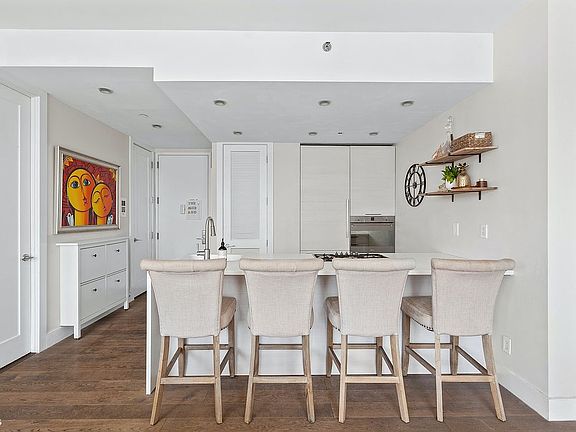Lined with floor to ceiling windows in every room and an open southern exposure, there is an abundance of natural light all day. With an open kitchen and a large Corian island that spills into a spacious living room, there are multiple options for a dining area. A rarity in the condo market today.