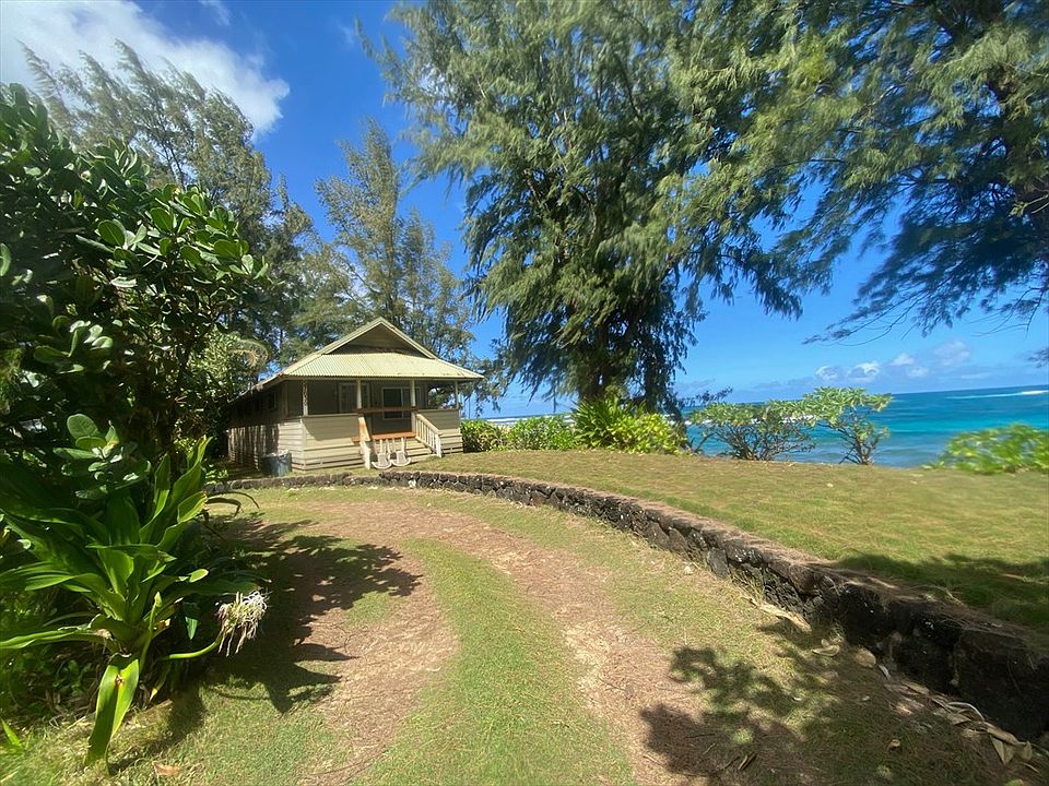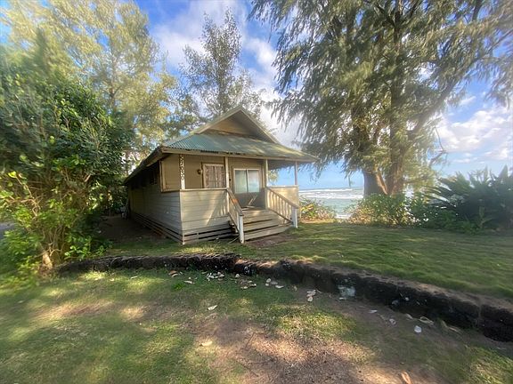 The open concept floor plan 1bd/1ba home is 768 sf with a 128 sf covered lanai and the shed is 320 sf, approximately. One bedroom one bath beach house with detached storage shed on the road from Hanalei to Haena, on the North Shore of Kauai known for summer sunsets, winter surf, waterfalls, beautiful mountains and more. Home features an open concept floor plan with vaulted ceilings and ocean views from every room. Wastewater is private cesspool. Home has not been professionally inspected. Buyer to due their own due diligence.The lot is wide at front and rear, with wide road and incredible ocean frontage along a sandy beach. The lot is narrow between road and beach.