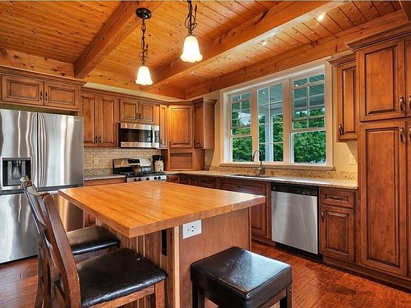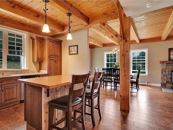 Welcome to your dream retreat in Underhill! This stunning property sits on 2.5 acres of picturesque land, offering seasonal views of Mt. Mansfield and a tranquil outlook over a protected meadow from your charming front porch. As you drive down the private driveway, you'll immediately appreciate the expansive, beautifully landscaped yard, perfect for entertaining and enjoying the great outdoors. The inviting stone patio and freshly stained, cedar covered front porch lead you into the heart of this home, where a cozy post & beam interior awaits. The open-concept layout features exposed beams and an abundance of natural light. On the 1st floor, you'll find beautiful engineered hardwood flooring throughout, a spacious kitchen with a butcher block island, dining area, and living space complete with a pellet stove for a touch of Vermont charm. Also on this level is a convenient office and generous sunken mudroom with radiant heat. A southern yellow pine staircase leads upstairs to 3 bedrooms with new carpeting, including a primary suite with a walk-in closet and 3/4 bathroom. A full bathroom completes the 2nd floor. The basement offers a versatile finished rec room with gas stove and well-appointed workshop area. Additional features include a 2-car garage and a shed, providing ample storage space. This meticulously maintained home, built just 11 years ago, is a private sanctuary with all the modern updates under 30 min from Stowe and Smuggs.