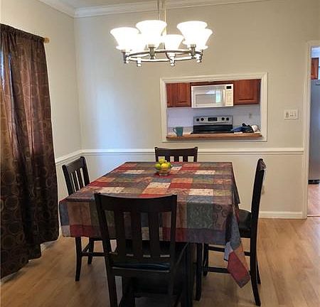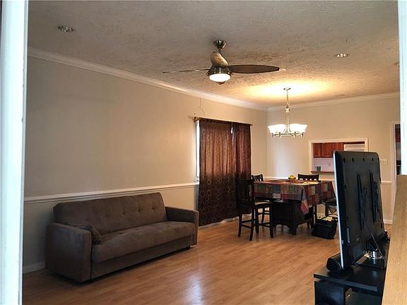 Beautifully kept home located on the corner lot of a quiet neighborhood street. The glass etched entry door opens into a large open concept living and dining room with hard wood floors and plenty of natural light. The living room features a surround sound system, perfect for movie nights. The open wall between the kitchen and dining room will make entertaining a breeze. A few high stools added could turn this space into a great breakfast bar. Two bedrooms, located on the first floor, feature nice sized closets. The extra large bath boasts a double sink and a first floor laundry with plenty of shelving. Exit the kitchen onto the secluded deck that leads to a large fenced in yard. Plenty of space for picnics and outdoor festivities. The upstairs area would make a perfect home office, study or teens bedroom. The basement is partially finished with new flooring and plenty of storage.