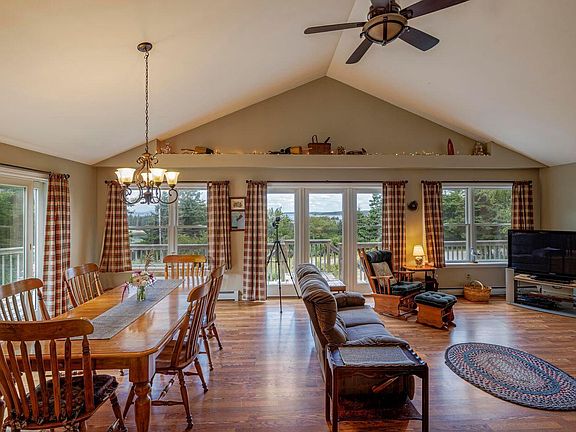 Enjoy sweeping views of the Isle au Haut Thorofare and Penobscot Bay from this year-round island home. Open concept kitchen, dining and living area with cathedral ceilings and sliding glass doors leading to a waterside deck. Spacious primary bedroom suite with walk-in closet and private bathroom. Guest bedroom with access to a second full bathroom. The heated shop room is perfect for projects or could be converted to additional living space. Also includes a large shed with windows and a small chicken house. Located near the town library, grocery store, post office and landing. Isle au Haut is serviced with daily passenger boat service from Stonington. More than half of the island is part of Acadia National Park, protecting its rugged beauty in perpetuity.