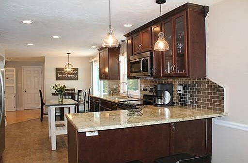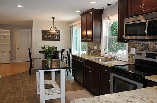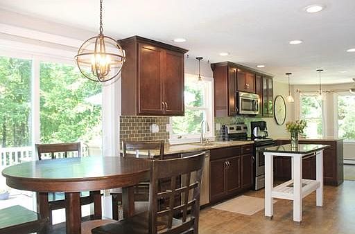 - Kit Dscrp: Flooring - Vinyl, Dining Area, Countertops - Stone/Granite/Solid, Deck - Exterior, Remodeled, Country Kitchen