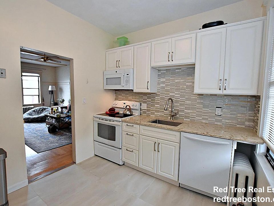 This charming penthouse condo has a unique Victorian architectural detail including gorgeous tooled leather walls, a built-in hutch, and a decorative fireplace. The unit, which was originally built for Harvard graduate students, offers a cozy living space with 2 bedrooms and 1 bathroom. In warm ivory and tan hues, the newly renovated kitchen has beautiful, high quality cabinetry, quartz countertops, ceramic tile flooring, garbage disposal, and a washer/dryer. There's also a large pantry with shelves and drawers. Bathroom is brand new and gorgeous. In addition to the total finished area, it has a spacious porch, a storage area in the basement, and a deeded parking spot. Particularly in the spring, Bellvista Rd. is breathtaking with its many cherry trees in full bloom. This well-managed historic home, which is close to public transportation (Green B & C Lines) is perfect for those looking for a low-maintenance lifestyle in a convenient location. Available for August 15th. Heat/Hot water included