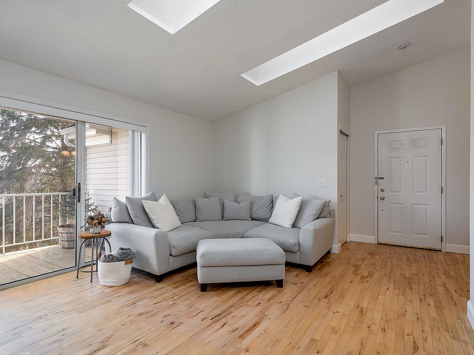 Bright, Top-Level, Corner Unit at Merrimack's Society Hill. Walk into the open living space with beautiful Maple hardwood throughout, living room with large sliders to a private deck and tall vaulted ceilings with skylights offering lots of natural light. Kitchen features all stainless-steel appliances and separate dining area. Walk down the hall to a full bath, cozy second bedroom and a Master with large walk-in closet, large windows and ensuite 3/4 bath. Updated recessed lighting and additional storage closet located on the same level. PLUS, in-unit laundry with newer washer and dryer, natural gas, newer furnace, Central AC, public water /sewer. Association amenities include pool, tennis court and clubhouse. Note -- photos were taken while property was furnished, unit now empty. OFFER DEADLINE - Wednesday 6/28 at 6:00pm