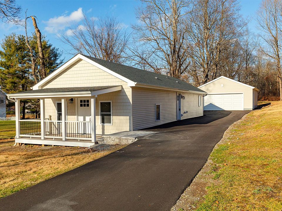 Impeccable renovation privately situated on 1.5 acres at the end of a quiet, no outlet street. 2 bedroom, 1.5 bath ranch w/well proportioned rooms and enticing layout. Large living room/dining room combo flows seamlessly into kitchen featuring center island, quartz counters & stainless appliances. Two spacious bedrooms and two full bathrooms w/designer finishes. Large scale renovation project equates to a home synonymous with new construction featuring new roof, windows, siding, framing, insulation, electric, plumbing, water heater & heat pump for energy efficient heating & cooling. Freshly paved driveway. Front porch and expansive yard for outdoor enjoyment. Massive detached garage is an auto enthusiast or hobbyist's dream, as it provides tremendous space for storage or workshop. Additional shed for abundant storage. Enjoy the conveniences of municipal water & sewer, plus a central location just minutes from shopping, dining, commuter routes and Poughkeepsie train station. One level living at its finest.