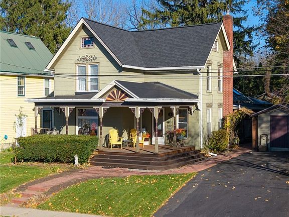 Charm & character abound in this lovingly maintained village victorian! This beauty offers spacious rooms graced with gleaming wood floors throughout! Gorgeous cherry kitchen boasts 42" cabinets, cathedral ceiling w/ skylights, 2 pantries, all appliances, built in hot water dispenser & cherry w/ granite dining peninsula! Atrium doors lead to a wonderful stamped concrete patio w/ permanent gazebo! Comfortable & cozy family room w/ original stained glass window, lighted tray ceiling and elec fireplace! Updated 1st flr powder room! Fully fenced oversized lot showcasing a backyard oasis w/ amazing perennial gardens, stamped concrete pathway, three storage sheds, a small koi pond (currently no fish) & private side porch with spa! Expansive new custom Brazilian hardwood front porch w/ LED lighted steps (2022). New tear off roof w/ gutters, downspouts and leaf guards (2024). New sewer line to the street (2023). HE Rheem furnace (2016). Gas hot water heater (2020). Updated vinyl tilt-in sash windows! Annual village taxes include refuse collection, brush/yard waste pick up & sidewalk plowing! Don't miss this amazing opportunity! Delayed negotiations, Wed. 11/13/2024 at 12 noon.