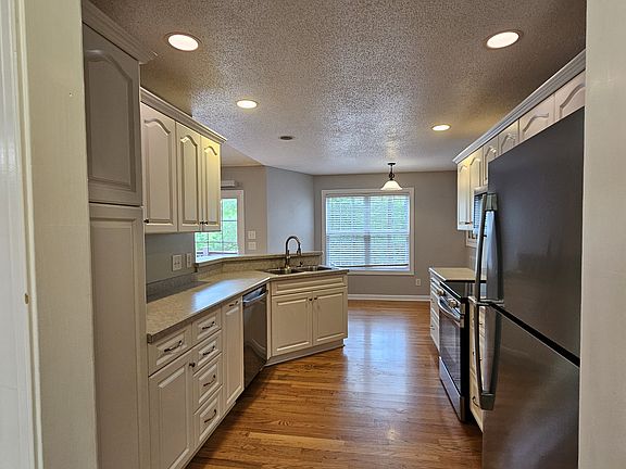 Single level split bedroom plan offers an open floor plan, cathedral ceilings, hardwood flooring that give this home a spacious feel! Galley style kitchen offers custom cabinetry with pantry, laminated counter tops with breakfast nook and bar. Appliances include a refrigerator, dishwasher, stove, disposal, and microwave. Laundry room has tile flooring, W/D hookup, cabinetry and shelving with access to the garage. Open Cathedral Living/Dining area. Master suite offers sitting area, walk in closet, & private bath with twin vanities, garden tub, glass enclosed shower, linen and water closets with tile flooring. Private guest wing with three bedrooms & ample closets, full bath & linen closet. 2 Car Garage plus overhead storage with pull down stairs for light items. Outside you will find a back deck perfect for grilling out. Extra outdoor storage. Located in the neighborhood of Pinehurst # 6. This home has great storage and tons of style! Tenant pays utilities, yard maintenance, No smoking, one small dog allowed with owner approval.